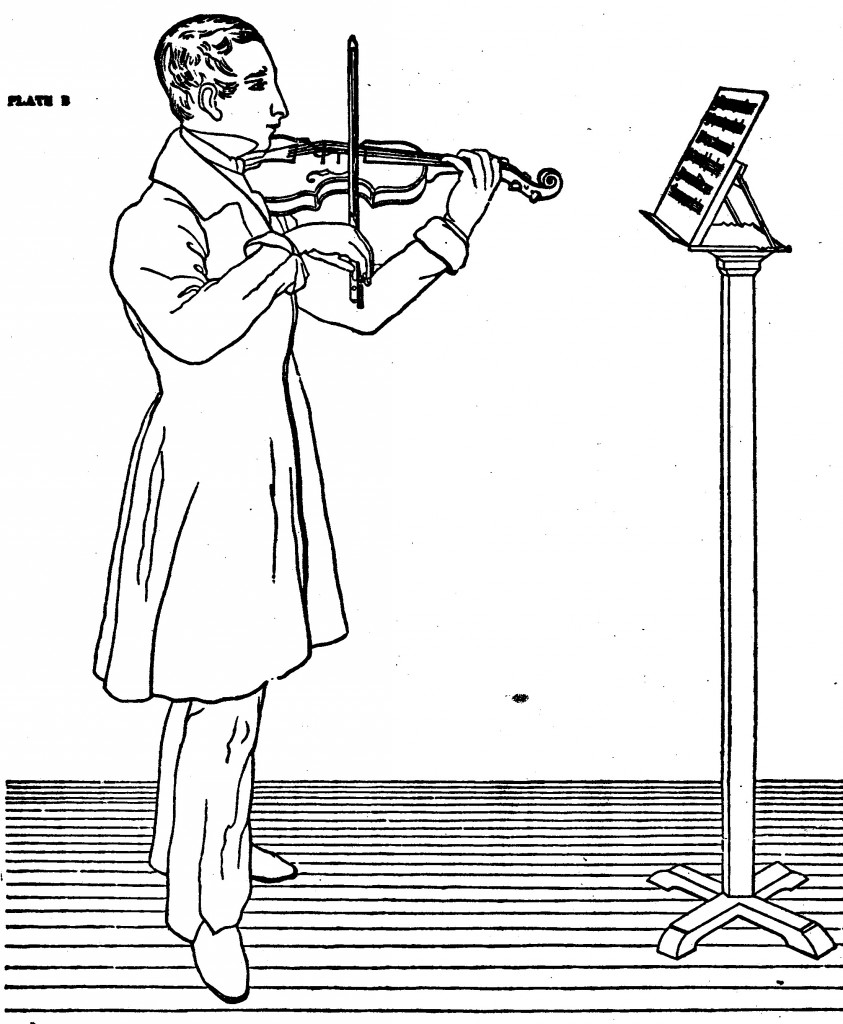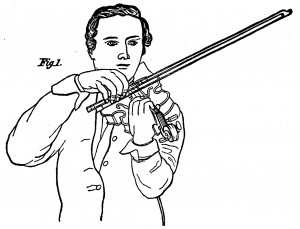 Pictures in contemporary violin treatises shows violinists with the elbow very close to the body and a very delicate, bent wrist. Spohr writes in his Violinschule (picture right and below) that